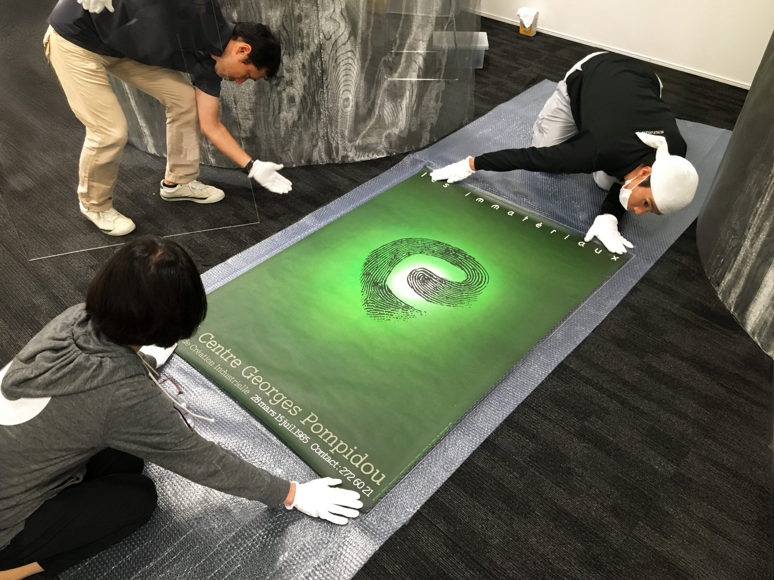 Mardi 6 septembre 2016, 15h30, Kyoto. Pour l’exposition qui va ouvrir à la galerie ddd, « Materiality-Immateriality » (à qui je dois le séjour), l’affiche des Immatériaux, du Centre Pompidou en 1985, dessinée par l’ami Luc Maillet, a été précieusement transportée. Elle est encadrée pour présider un espace où l’on évoque l’exposition parisienne historique. À son retour à Paris, quelques mois plus tard, il faudra payer quelque chose comme 150 euros pour la « dédouaner ». Mais l’événement a contribué à la renaissance de cette affaire qui va nous occuper au moins jusqu’en 2025. (Date à laquelle ce billet est ajouté : 5 décembre 2025).