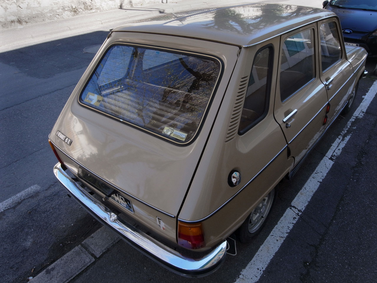 Samedi 2 avril 2011, 11h20, Boulevard Pierpont Morgan, Aix-les-Bains. Conçue à partir de 1966, présentée au Salon de l’Auto de Paris en 1968, fabriquée dans l’usine Renault de l’Île Seguin à Boulogne-Billancourt, la R6 est une berline semi-break, concurrente de la Citroën Ami 6 ou de la Simca 1100. Considérée à l’époque comme pratique mais banale ou même laide, on peut lui trouver aujourd’hui un certain chic modeste et une note avant-gardiste (les formes creusées, la couleur). Il s’agit ici d’un modèle des années 70.