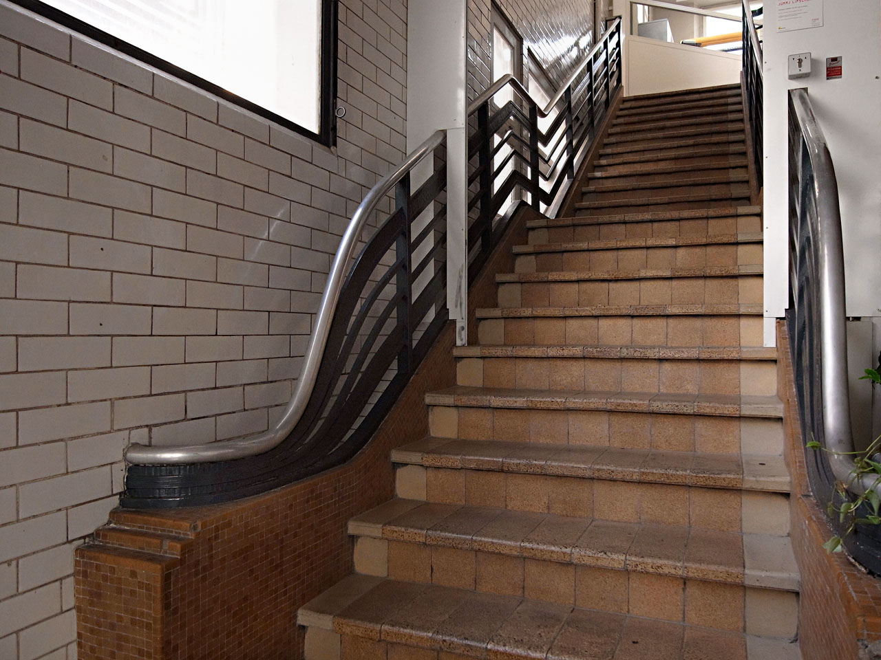 Escalier des douches Dimanche 5 juin 2011, 18h, rue Legouvé, Paris 10e. La galerie Les Douches occupe d’anciens bains-douches municipaux des années trente. Ce soir : rencontre avec Anne L. sur la conservation du « Net Art ».