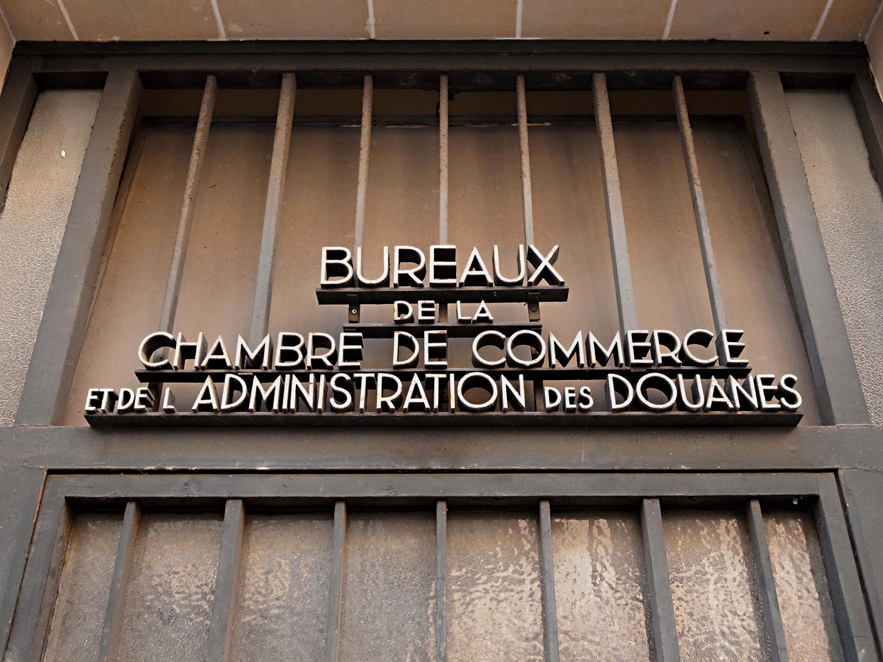 Douanes etc. Dimanche 5 juin 2011, 20h, rue Léon Jouhaux, Paris 10e. Immense bâtiment des Douanes et de la Chambre de commerce, etc., avec, intégrés à l’architecture des portes et des façades, pas mal de détails typographiques en acier ou en béton.