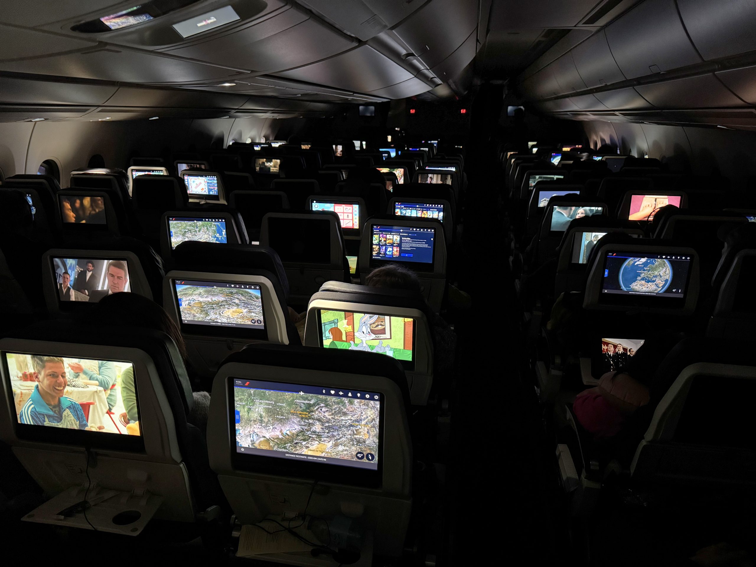 Vendredi 14 mars 2025, 18h37 heure du Japon. De l’aéroport KIX (Kansai Osaka) à l’aéroport CDG (Paris Charles de Gaulle), environ 10 000 km. Restent 7300 km pour 8 heures, le trajet durant environ 13h. Le départ a donc eu lieu vers le nord-est en direction du détroit de Behring, pour éviter la Russie. On va survoler l’Alaska, le Groenland, l’Islande, l’Écosse.